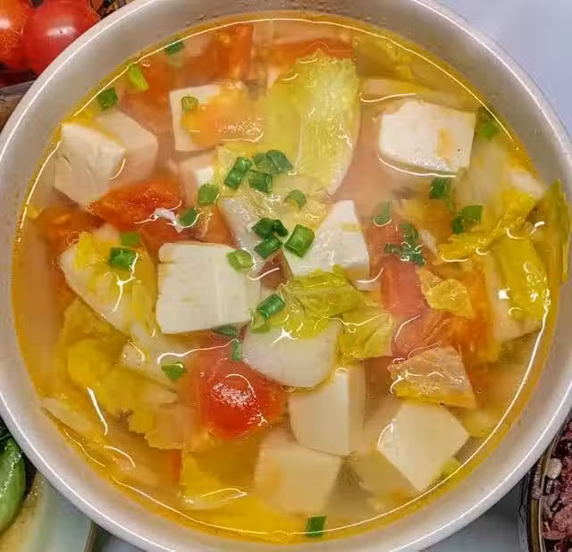 (1)番茄洗凈切塊,娃娃菜洗乾淨切段,豆腐切小塊,小蔥切蔥花,蒜瓣剝皮切末。