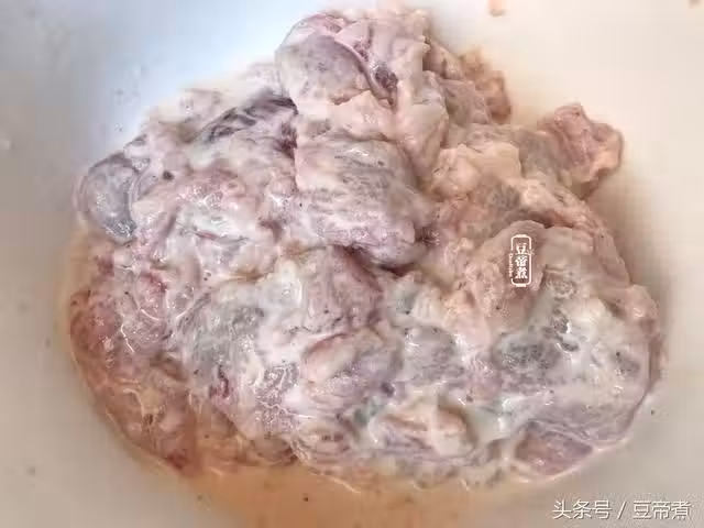 5、肉腌制完成後打入一個蛋清,如果製作比較多的話蛋清就要增加這點要注意。抓捏均勻後加入麵粉、玉米澱粉及少許的熟油和水,再次抓捏均勻備用。(如果喜歡香酥一些那麼您的澱粉質就要製作厚一點)