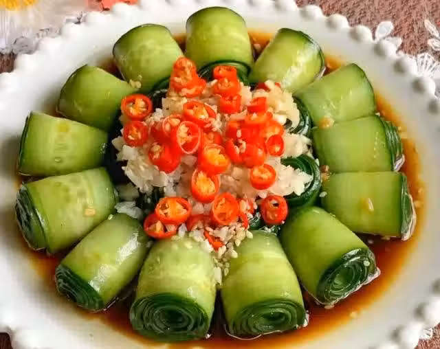 (3)再將的料汁,淋入黃瓜上面,再淋入一勺熱油,激發出香味即可,爽口開胃又下飯,年夜飯餐桌上必備的一道家常菜。