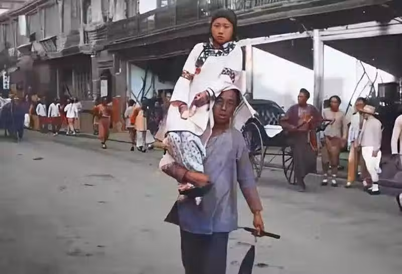 在清朝時期,從事這一行的男子叫「龜奴」,坐在肩膀上的是青樓女子。他正準備將她送到指定的地方。