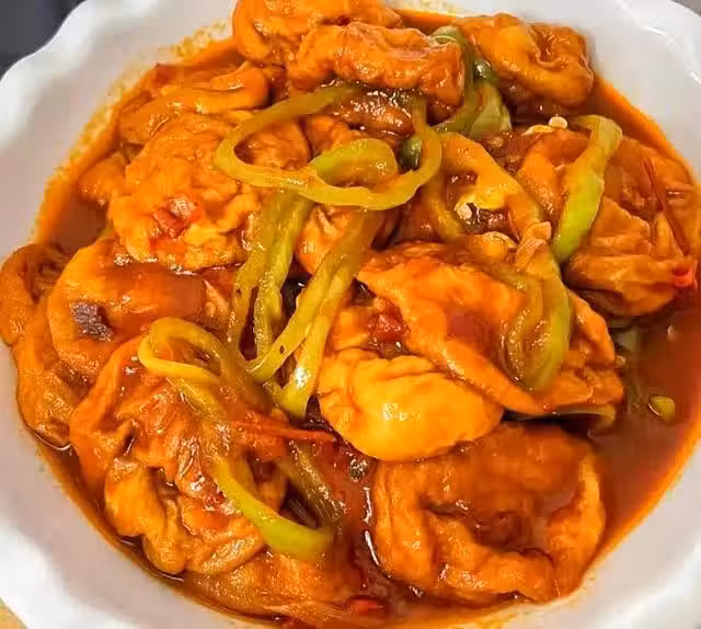 (5)再加入適量的生抽、蚝油、食鹽、白砂糖調味,再加入適量的青椒絲蓋上鍋蓋。