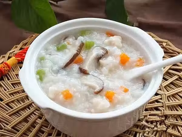 食材:雞脯肉 (150克)、香菇 (2朵)、大米 (150克)、鹽 (適量)、雞精 (適量)、薑片蔥末 (適量)、香菜末 (適量)。