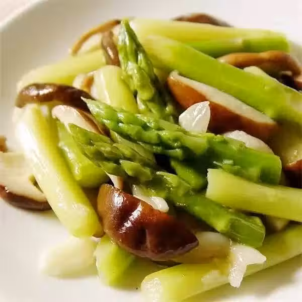 食材:蘆筍 (250克)、鮮香菇 (4朵)、紅、黃椒 (各1小塊)、干辣椒 (4個)、蒜 (1瓣)、姜 (1小塊)。