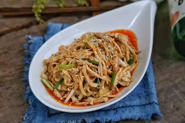 雞肉用手撕成絲,越細越入味啊,倒入沙姜蒜末
