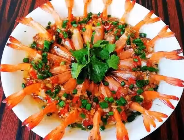 (3)粉絲泡軟後擺入盤中間,蝦頭豎著靠在中間粉絲上,將調好的料汁淋在大蝦上。