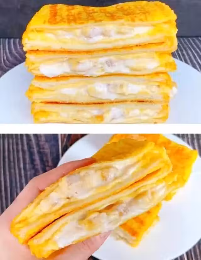 (2)吐司片鋪上一層芝士片和香蕉酸奶,在鋪上一層芝士片,將其四面沾滿蛋液