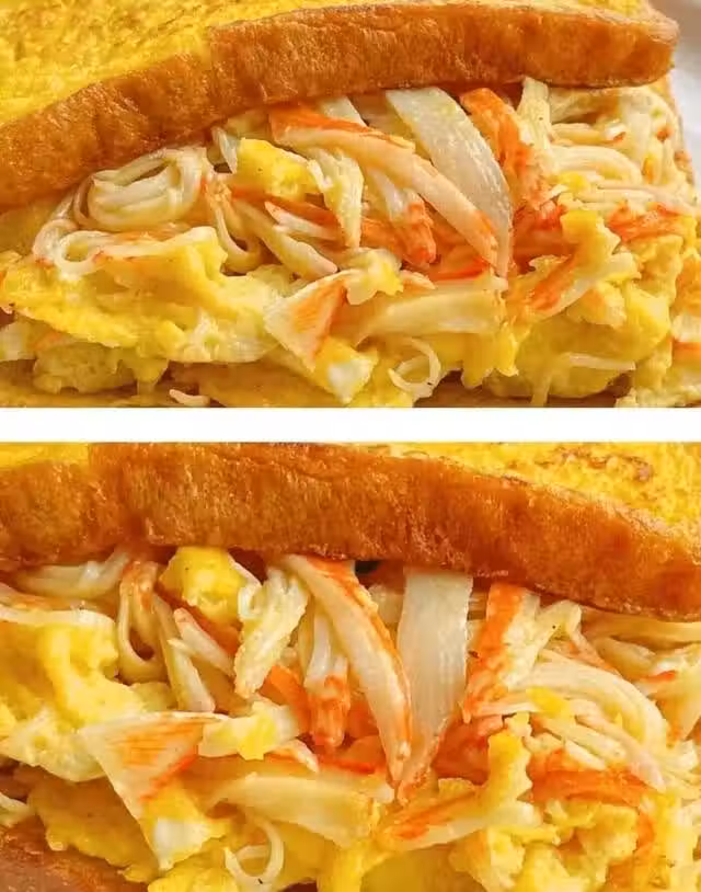 (3)將蟹柳雞蛋放在吐司片中間,最後保鮮膜固定就可以開吃啦,特別香特別營養孩子也喜歡吃✅