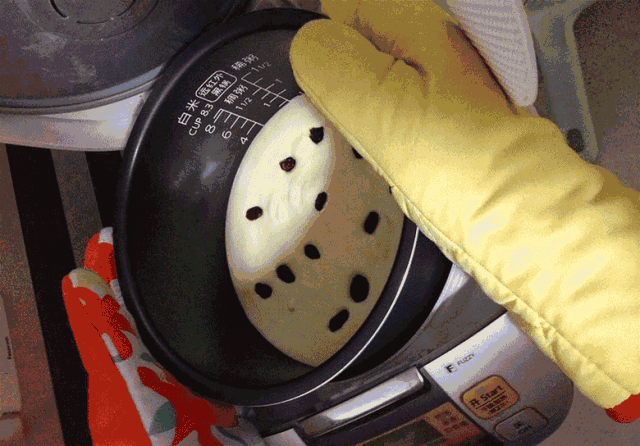 蛋糕原料倒入抹好黃油的電飯煲後,一定要輕輕震兩下,防止有氣泡。