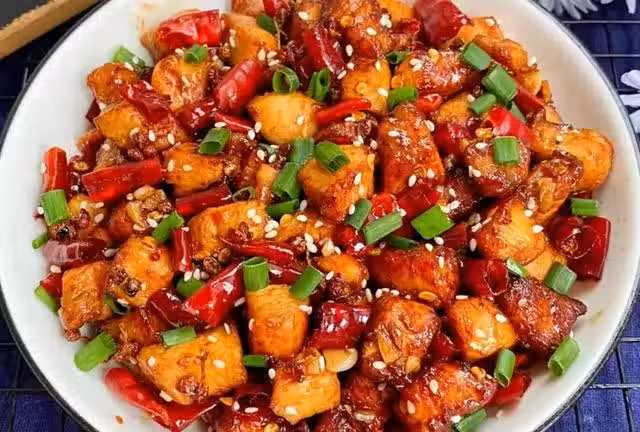 (3)鍋中熱油下入腌制好的雞肉丁,炸至金黃色撈出,油溫升高再復炸一次。