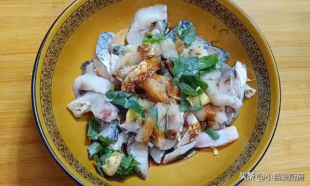【步驟二】:再用手抓拌均勻,抓到水發粘為止 ,然後放入2勺澱粉,繼續抓拌均勻,讓魚塊裹上一層薄薄的澱粉,再放入20克植物油拌勻後再次腌制10分鐘。