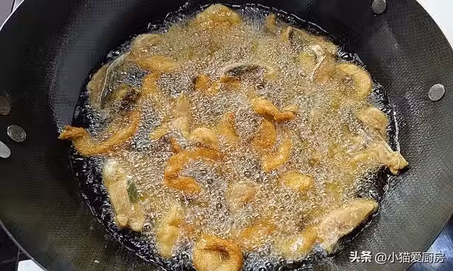【步驟五】:魚塊炸熟,開始變金黃撈出,然後等油溫再次上來以後,將魚再次倒進去,復炸一遍,炸到魚變得金黃色酥脆撈出控油備用。