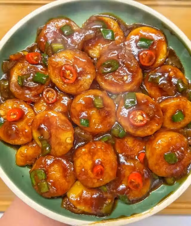 (4)再倒入調好的料汁,蓋上鍋蓋,燜煮至湯汁濃稠入味,再撒上適量的青紅椒圈。