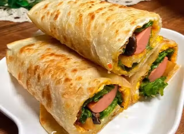 (5)再放上生菜和火腿腸,捲起來即可開吃了,做法簡單又省事孩子喜歡吃!