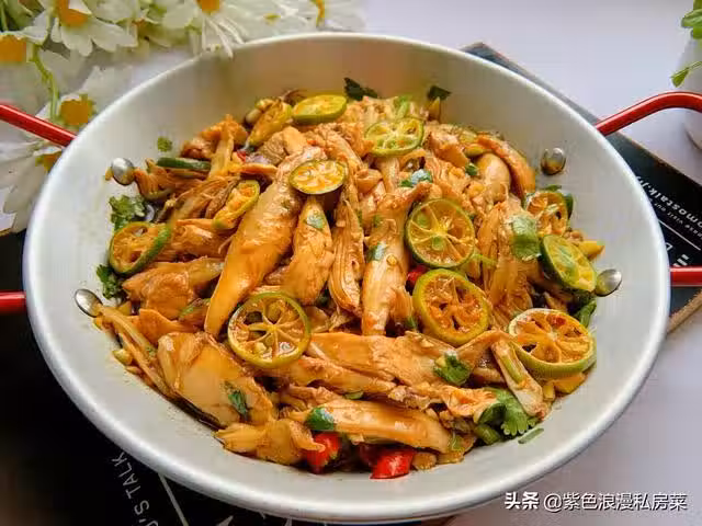 2.雞腿肉撕成條+蒜末+小米椒+香菜,+3勺生抽+2勺香醋+鹽+小半勺白糖,喜歡吃辣的放一點辣椒油,放青檸拌勻即可食用。
