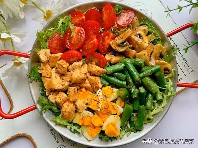 雞蛋兩個,雞胸肉一小塊,千禧果適量,蘆筍適量,口蘑三個,苦菊適量。