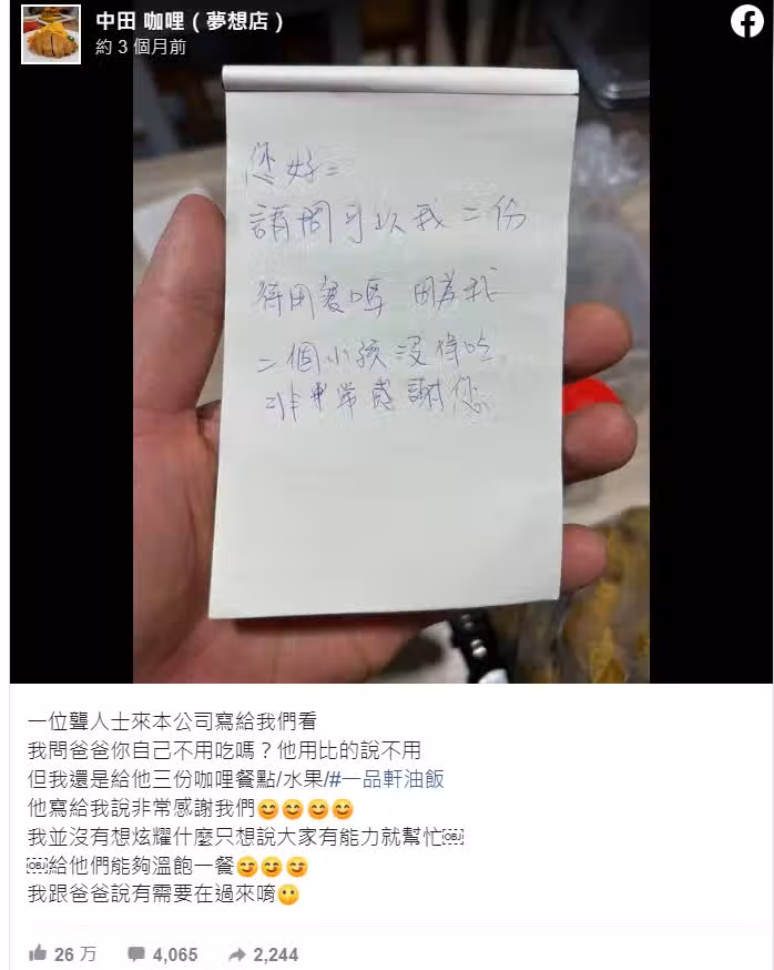 這則貼文發布後,立刻吸引了16萬人按贊,網友們都為老闆的善舉感動不已,紛紛留言盛贊,「人間處處有溫暖」、「好人一生平安向上」、「我相信手心不得已,手心」依序必得福份」、「不是炫耀,是在影響大家去幫助人」、「台灣人就是有人情味」、「好感人的故事」、「希望孩子們吃飽,爸爸也是」。