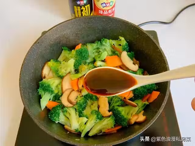 6.放一勺生抽,一勺蚝油,適量的鹽,翻炒均勻。