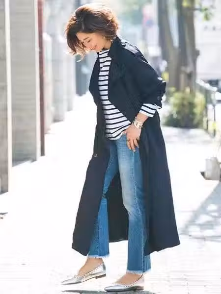牛仔面料的單品可以為中年女人帶來不錯的減齡效果,在穿搭當中選擇這樣一款牛仔喇叭褲,個性又時髦,和深色風衣外套搭配,經典又顯大氣。