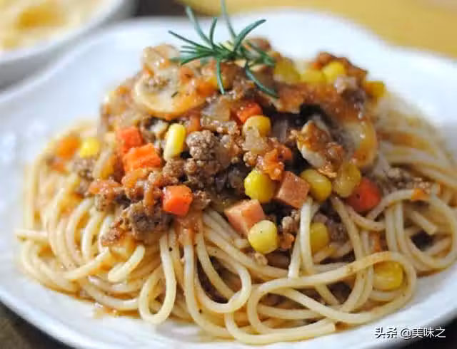 義大利面、牛肉、蔥、蘑菇、番茄、玉米粒、胡蘿蔔粒、火腿粒、橄欖油、黃油、蒜、鹽、糖、羅勒、黑胡椒粉。