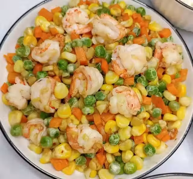 (2)焯水:鍋中倒入適量的清水煮沸,下入豌豆粒、胡蘿蔔丁、玉米粒焯水片刻撈出,瀝干水分盛入盤中備用。