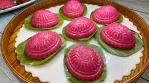這個食譜使用的番薯是日本番薯,其外皮為紫色,內部則呈黃色。蒸熟的番薯泥是帶有一點熒光效果的黃色,非常好看。另外,也可以嘗試使用紫薯泥和綠豆餡來做紅龜糕,口感和味道都會稍有不同,同樣美味。