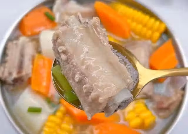 (1)山藥洗凈去皮切塊,肋骨洗凈切塊,放入碗中,加入少許鹽,浸泡片刻,胡蘿蔔洗凈去皮切塊,玉米切段,蔥切圈,姜切片。