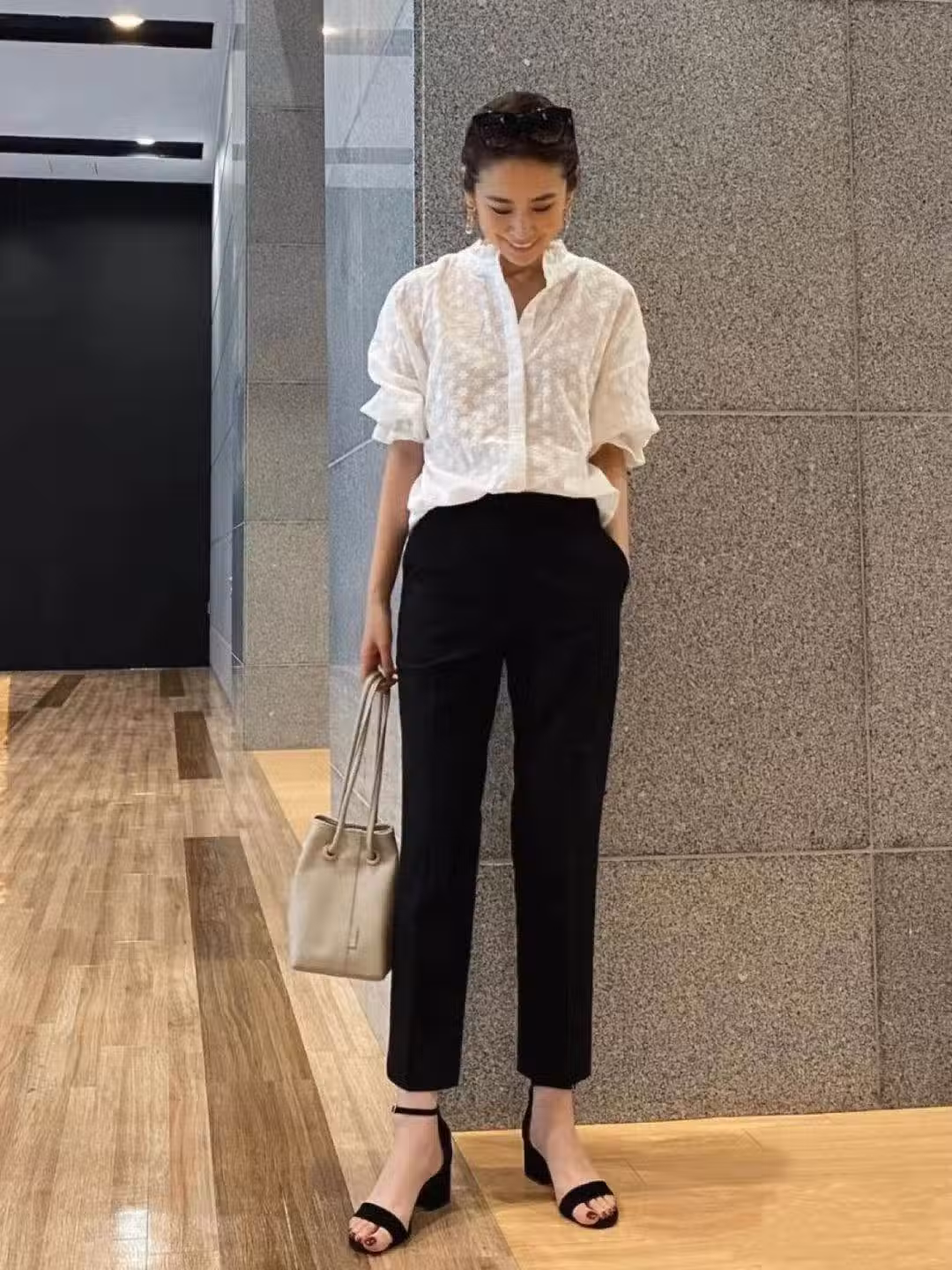 1、襯衫+煙管褲無論是襯衫還是煙管褲,都是主打簡潔俐落的基礎款,襯衫正式簡潔,而煙管褲俐落流暢,這兩種單品相互組合後,可以營造出幹練不失優雅的通勤風。身處職場上的四五十歲女人如果沒有搭配頭緒,那麼可以採用這種搭法,但別忘記通過將襯衫袖口捲起來提升清爽感。