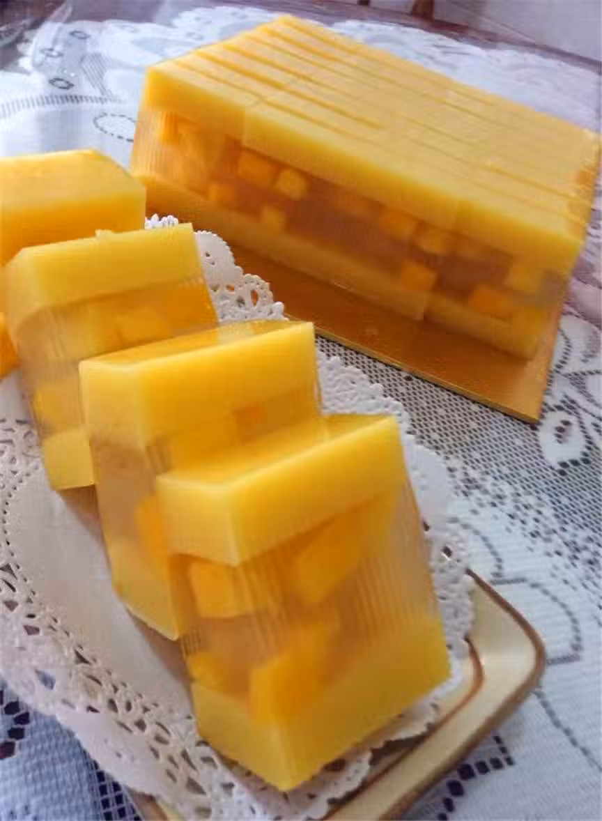 把透明層分3次倒下,排下芒果,待半凝固,再倒下燕菜,這樣就會分布平均,漂漂亮亮的出模啦!
