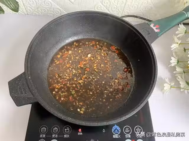 8.鍋中放少許油,放大蒜,小米椒爆香,倒入碗中,炒濃稠。