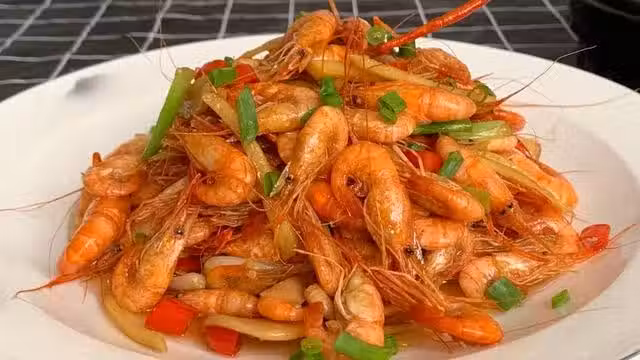 起油鍋,待油熱將蒜、小米辣爆香,然後加入少量鹽,再將腌過的河蝦倒入爆炒
