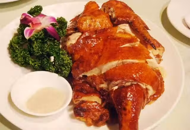 4、再將土雞切塊,裝盤並擠上檸檬汁,沾椒鹽一起食用。