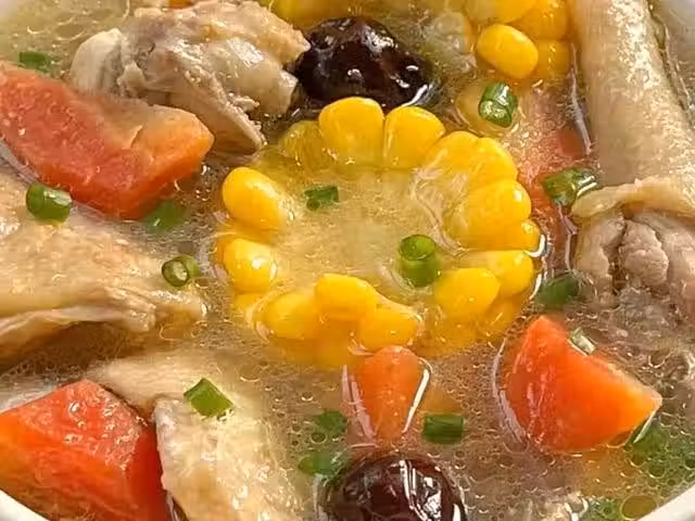 3、時間到,胡蘿蔔玉米雞湯燉煮好了,加入食鹽調味,煮至入味後,撒上蔥花即可出鍋開吃。