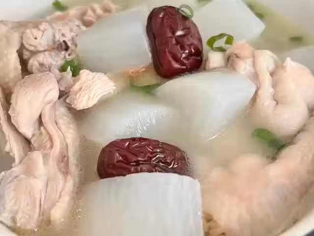 準備食材:雞肉,白蘿蔔,薑片,蔥結,紅棗,枸杞子,蔥花。