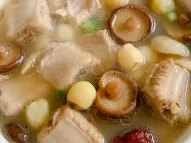 3、將排骨、香菇、蓮子、紅棗、薑片放入砂鍋中,加入足量的清水,大火煮開後轉小火燉煮一個半小時。