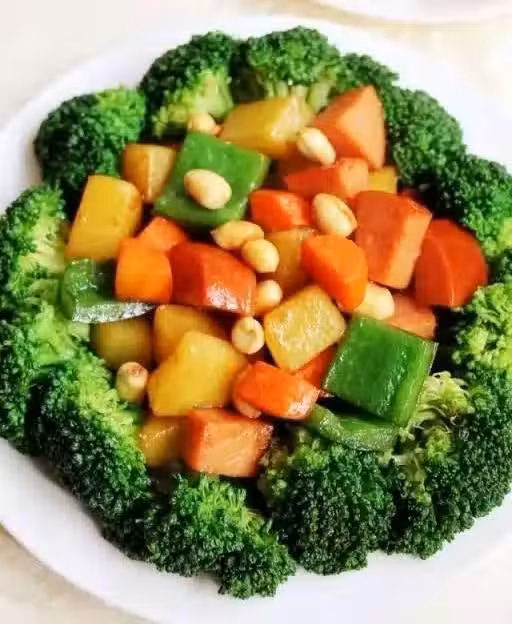配料西蘭花260g,適量的油,適量的鹽,適量的火腿,適量的蒜末,適量的雞精,適量的水澱粉。