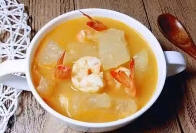 配料:500克冬瓜,十隻蝦,鹽,胡椒粉,薑片,料酒和花生油