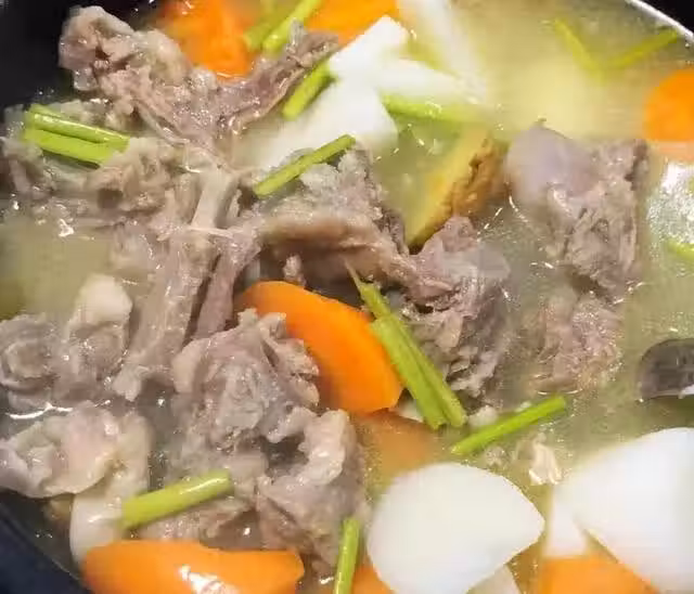 4.再加入胡蘿蔔山藥段繼續燉煮20分鐘,山藥軟爛後加入食鹽調味,最後撒上香菜。冬天天冷的時候,喝碗羊湯暖身又暖胃。