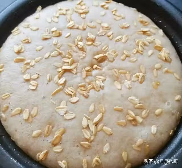 2.電飯鍋:電飯鍋內膽刷油,倒入麵糊。放到溫暖的地方醒發至兩倍大,再用筷子充分的攪拌排氣,上面再撒一些燕麥片,二次醒發15分鐘,按蛋糕鍵,約45分鐘到1小時左右,關電燜5分鐘。