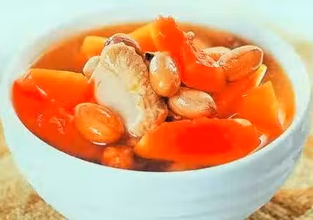 4、將木瓜塊、花生仁和排骨同放鍋中,加適量水,煲至花生熟透即成。