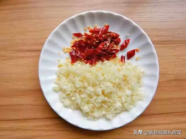 2.大蒜切丁,干辣椒切碎,喜歡吃辣的可以多放一點辣椒 不喜歡吃辣的不放或者少放。