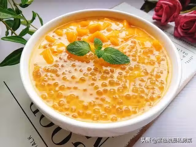6.西米放入碗中,倒入芒果奶昔,再放一些芒果,這樣一份美味的芒果西米露就做好啦!夏天吃我一定要放入冰箱冷藏一下,這樣口感更好了。