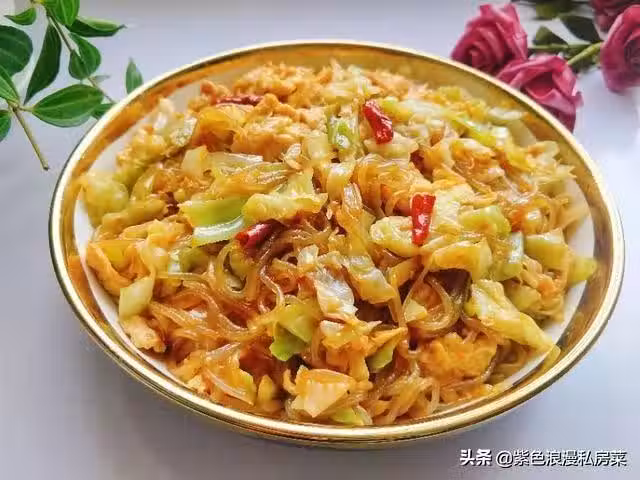 4.鍋中再放少許油,放大蒜,生薑,干辣椒爆香,放入包菜翻炒,放入粉條,倒入雞蛋,再倒入碗汁,翻炒均勻即可出鍋。