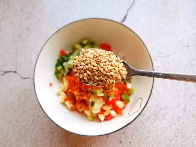 步驟二:放一勺白糖,適量的鹽,一勺辣椒粉,一勺白芝麻,一勺花椒粉(所有的佐料按自己做涼拌汁的多少和個人口味來增減)