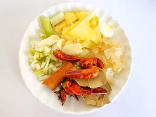 步驟二:生薑,大蒜切片,切蔥段,準備八角,桂皮,香葉,冰糖。