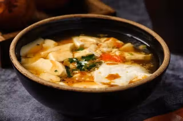 5、炒香以後添上1碗清水,大火燒開以後,來1勺蚝油調味,接著倒入1個雞蛋液,快速攪拌成蛋花,然後就可以關火了。豆腐腦成型以後,就可以舀出來啦,上面澆上滷子,然後來點辣椒油、香菜調味,或者來點自己喜歡的調料,撒上點香油,就可以開吃啦。