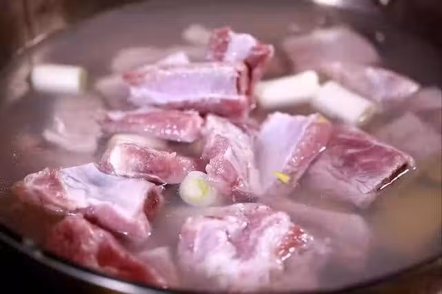 3、接下來,再將排骨清洗一下,多衝洗2遍以後,放在鍋子裡,添上適量的清水,之後來上幾片薑片,然後倒上少許料酒,下面開火進行焯水。焯水以後,將排骨撈出來,沖洗一下,沖洗時一定要用溫水,千萬別用冷水,不然會發柴。