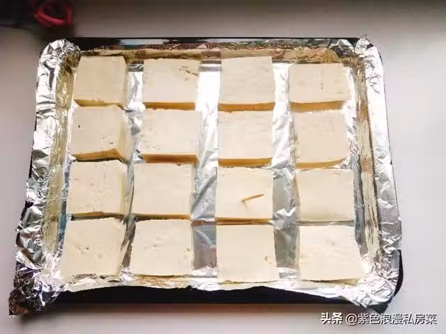 4.豆腐切小塊,這個不考驗刀功,可以切厚一點,烤盤鋪錫紙,並在錫紙上刷一層油,放入豆腐,用牙籤在豆腐上扎小孔,方便入味。