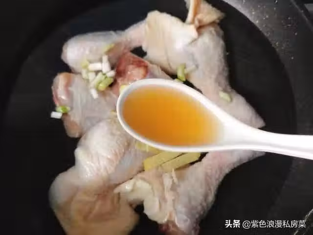 步驟二:鍋中放清水,雞腿冷水下鍋,放一勺鹽,幾片生薑,香蔥,一勺料酒,雞腿冷水下鍋。
