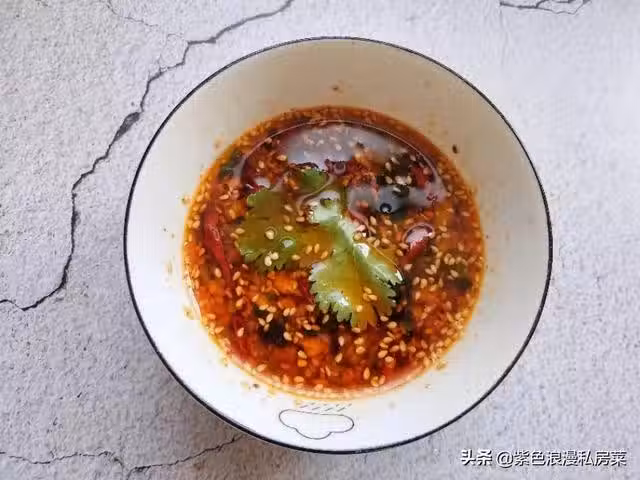 步驟四:做一個涼拌汁:根據自己的口味,碗中再放一勺辣椒粉,一勺熟白芝麻,澆上燒好的熱油,大蒜被熱油一澆,激發出了大蒜的香味。