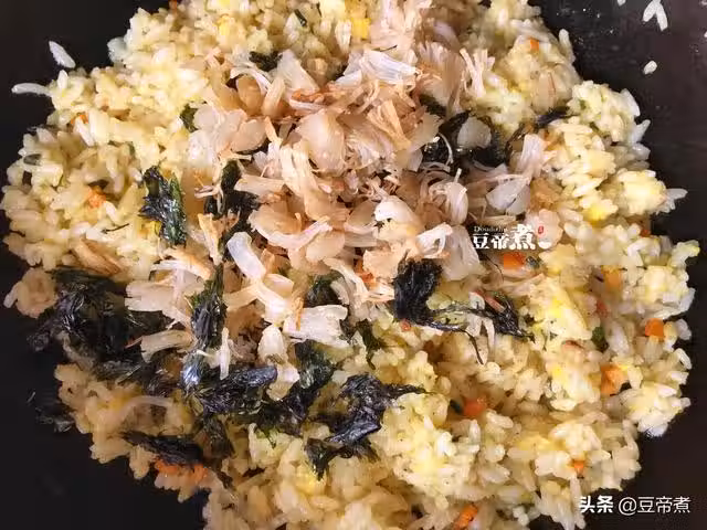 6、剩飯翻炒散之後,把蛋黃攪散淋潑在上面。然後迅速的翻炒,使米粒裹上一層蛋黃液。最後倒入之前準備好的乾貝、紫菜,並加入所需要的調味料翻炒幾下即可出鍋。